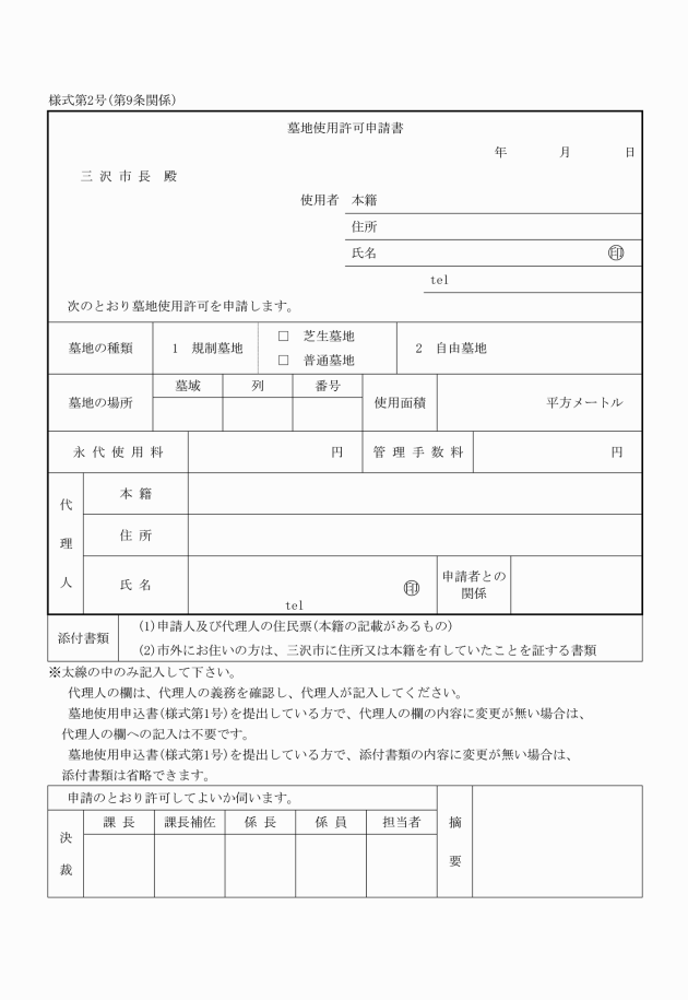第11条 使用権者が墳墓を構築しようとするときは、墳墓構築申請書(様式第5号)に、次に掲げる書類を添付して市長に提出し、承認を受けなければならない。