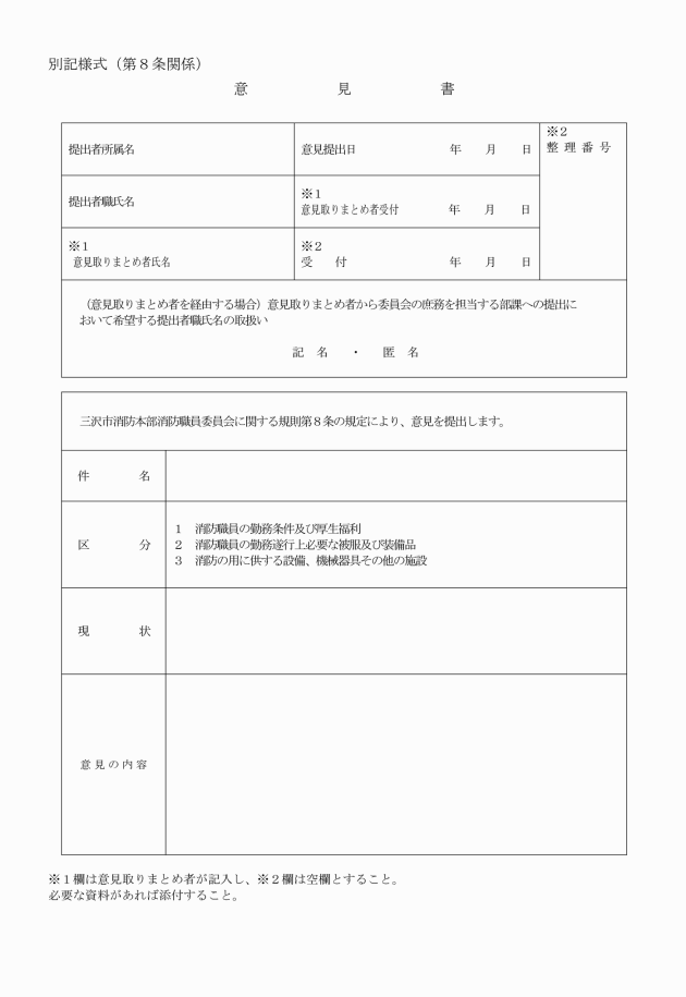 第8条 消防職員は、法第17条第1項各号に掲げる事項に関して、別記様式により意見取りまとめ者を経由して委員会に意見を提出することができるものとする。ただし、消防職員が意見取りまとめ者を経由することに支障があると考える場合においては、直接委員会に意見を提出することができるものとする。