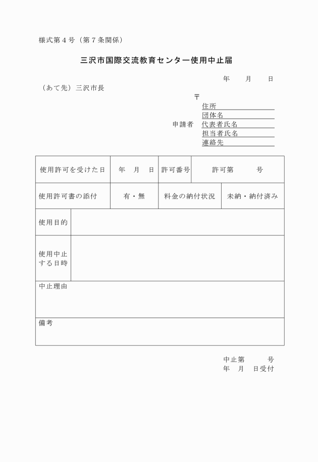 第7条 使用者は、許可を受けた施設の使用を中止しようとするときは、三沢市国際交流教育センター使用中止届(様式第4号)により市長に届け出なければならない。