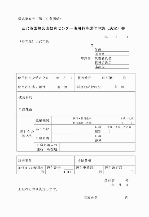 2 使用料等の還付を受けようとする者は、三沢市国際交流教育センター使用料等還付申請(決定)書(様式第6号)を市長に提出しなければならない。