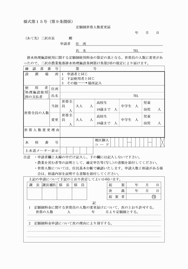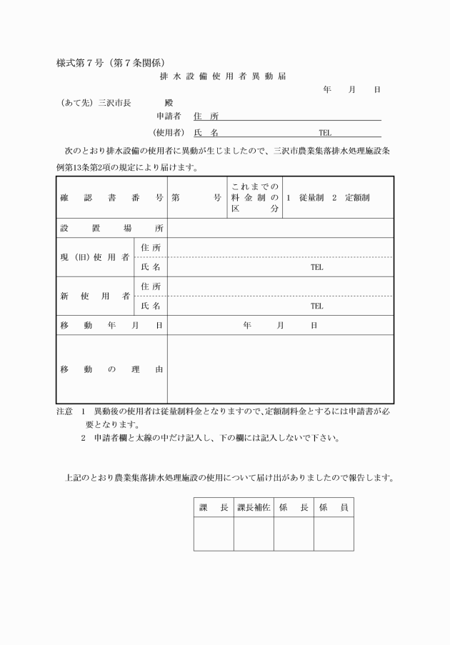 4 使用者は、汚水として排除される使用水に変更があったときは、排除汚水変更届(様式第10号)により届け出るものとする。